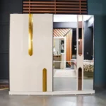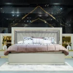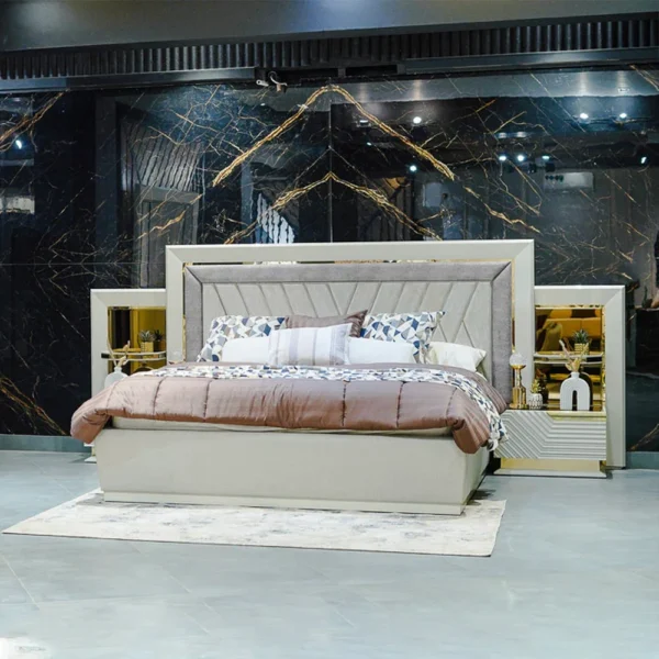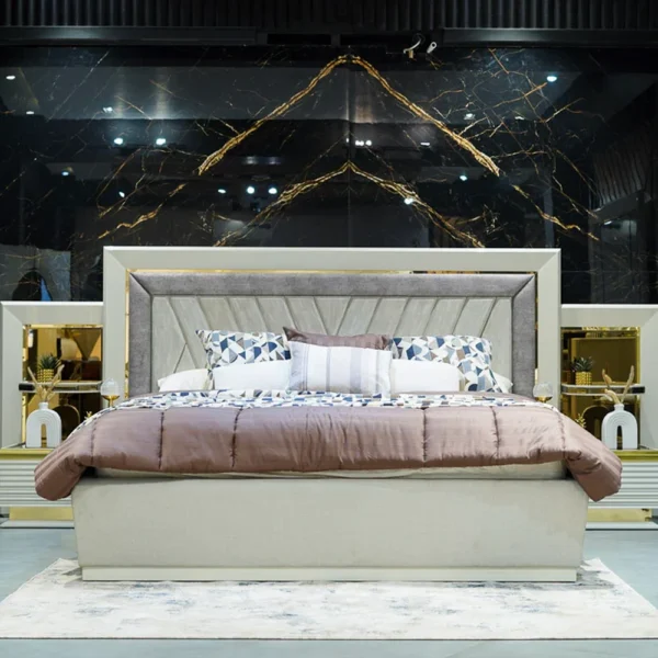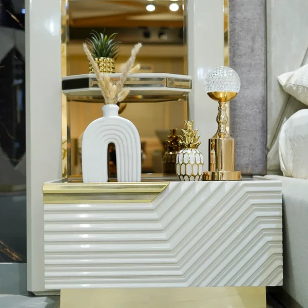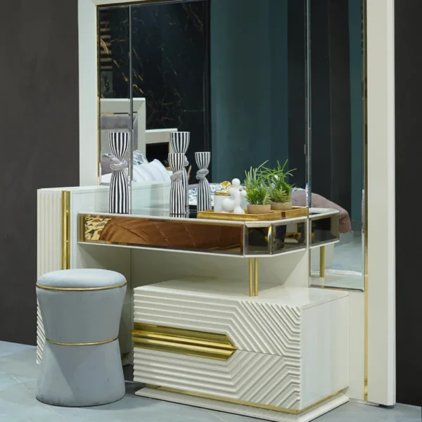 This complete Milky White bedroom set includes a bed, side tables, dresser with mirror, and vanity stool, enhancing your space with comfort and functionality. It features a premium design with a Chenille upholstered headboard, a high-gloss frame, and beautiful golden accents. Crafted from high-quality MDF with a glossy white lacquer finish and gold details, this set provides a modern, elegant look. Enjoy ample storage with 3D textured bedside tables and dresser drawers for superior organization. This Milky White bedroom set is perfect for modern interiors and ensures a durable build for long-lasting use.