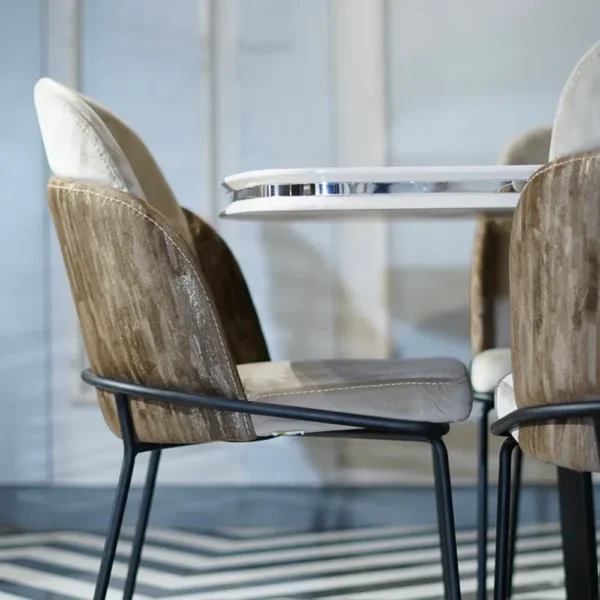 This elegant luxury dining table set with 8 metal frame chairs is perfect for modern homes, comfortably accommodating 6-8 people for family meals and gatherings. The Elegance set features an elegant high-gloss dining table with golden accents and a unique geometric base with a sleek black and gold finish. The stylish comfort is achieved with upholstered dining chairs featuring quilted backs and golden-tipped wooden legs. Constructed with imported MDF, this luxury dining table set ensures a durable build for strength, stability, and long-lasting use, elevating your dining space with elegance and functionality.