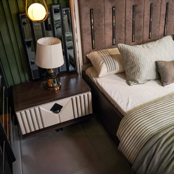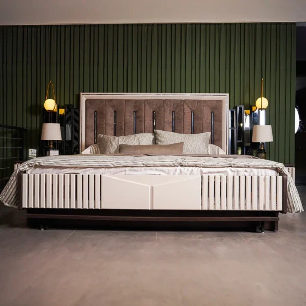Experience luxury with the Lotus PU Finish Bedroom Set. This comprehensive set features a bed with a premium Velvet upholstered headboard and beveled gray glass, matching side tables, a spacious dresser with a Belgium mirror, and a vanity stool. The Ivory White and Dark Brown laminated MDF is finished with a luxury PU matt finish deco and SS strips for a modern, elegant look. Offering ample storage and crafted from high-quality MDF, this PU Finish Bedroom Set enhances your bedroom with sophisticated comfort and functionality.