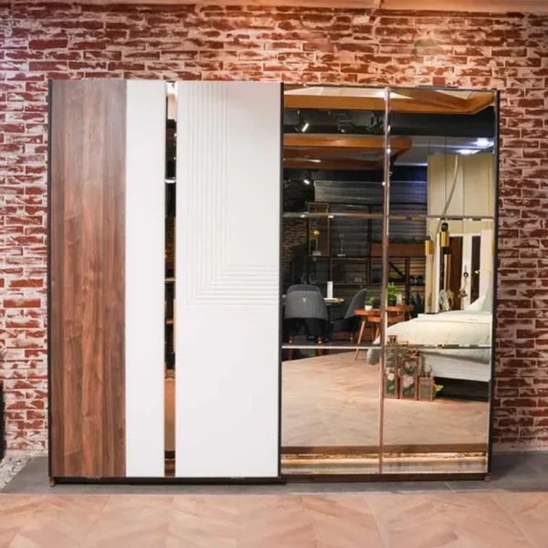 The Milano Wardrobe is a modern, space-saving sliding unit (W 96 × D 28 × H 90 inches) in Pure White and Brown. It features a premium finish, Dark Brown Glass, and integrated Belgium mirrors. Its smart storage design includes 4 dedicated portions for optimal organization. Built with strong Laminated MDF and a heavy-duty sliding track, this durable Milano Wardrobe is a stylish and functional solution for any modern bedroom.