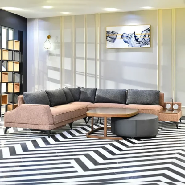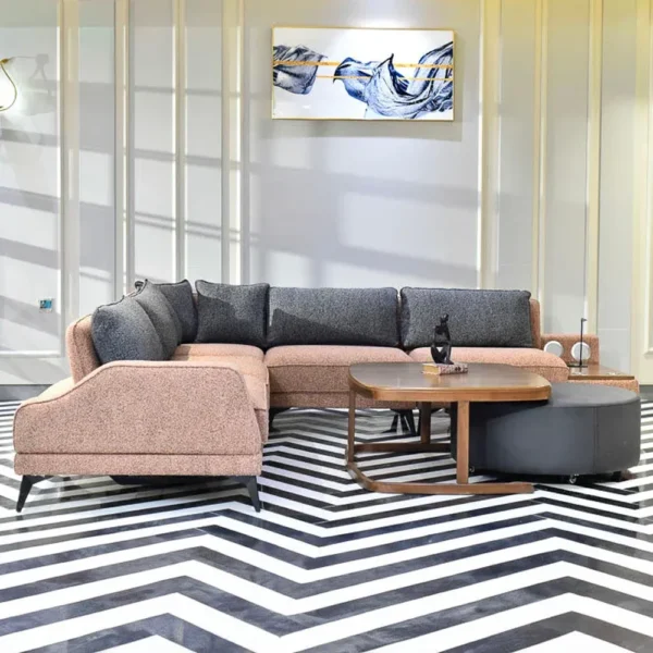 Introducing the Turkish Modern L-Corner Sofa in Brown & Blue Boucle, a stylish and comfortable centerpiece for your living room. The design features a convertible rotational backrest, allowing quick transformation into a daybed. Enjoy ultimate comfort with plush, high-density foam cushions and soft boucle fabric upholstery. Built with a durable, kiln-dried hardwood frame and metal legs, this versatile L-Corner Sofa is perfect for modern homes.